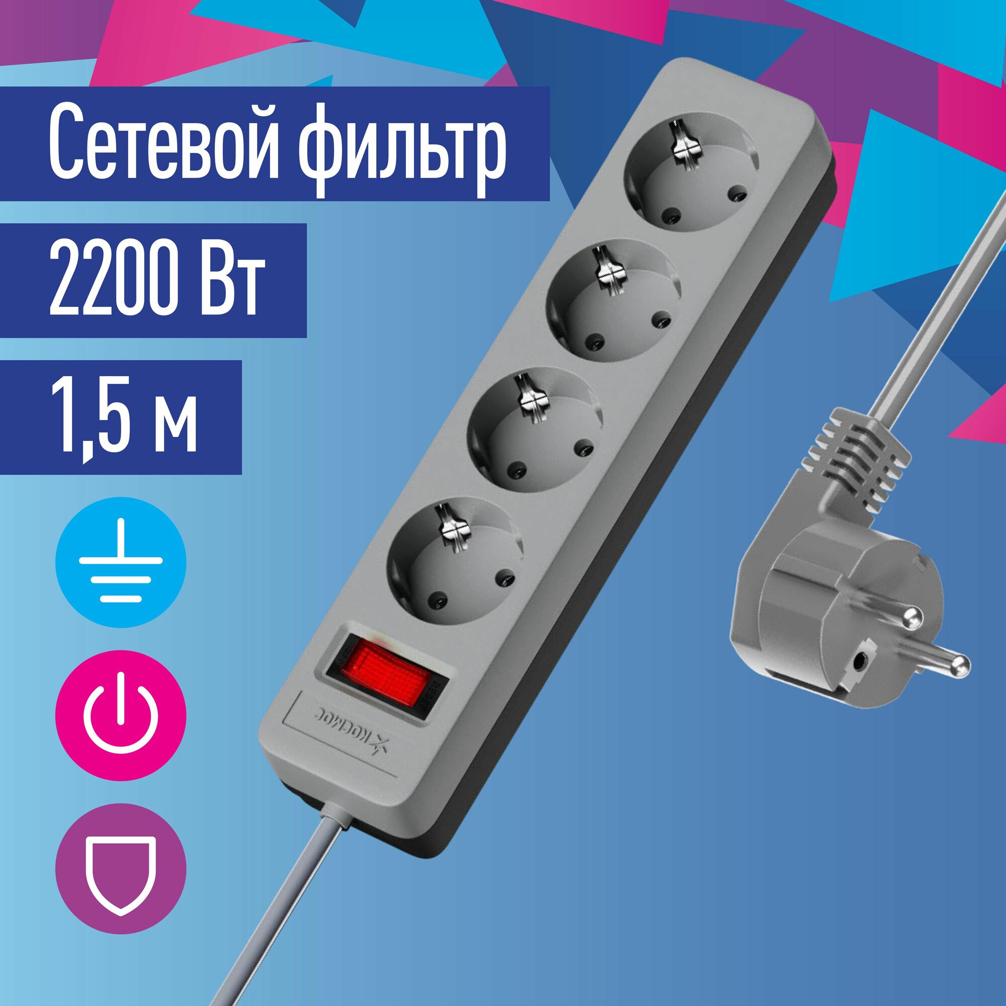 Купить Сетевой фильтр Космос Электро Космос 4х1.5м с заземл. 10А IP20 2.2кВт с пред. 3х0.75 индик. сети, серый, FKsm1.5m-4g(G)
