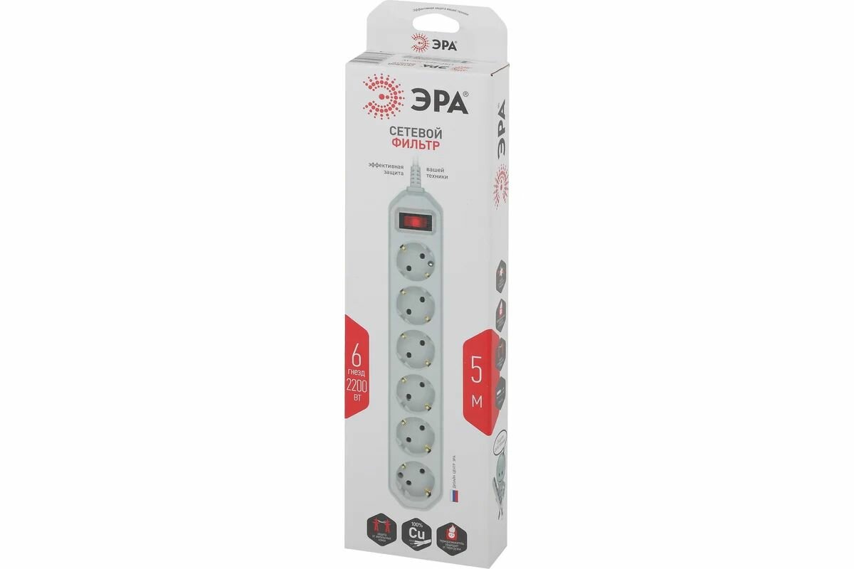 Сетевой фильтр ЭРА USF-6es-5m-W-BOX с заземлением с защитой с выключ 6 розеток 5 м белый