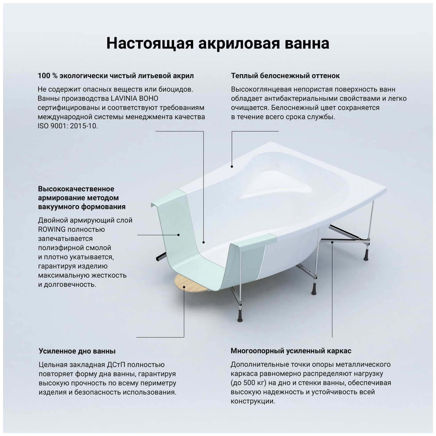 | Дополнительная информация | антибактериальное покрытие; максимальная нагрузка: 500 кг; диаметр сливного отверстия: 5,2 см; толщина стенок: 6 мм. |