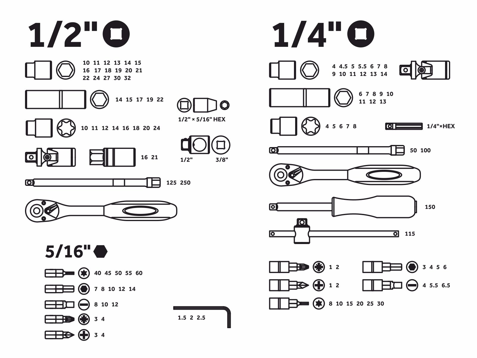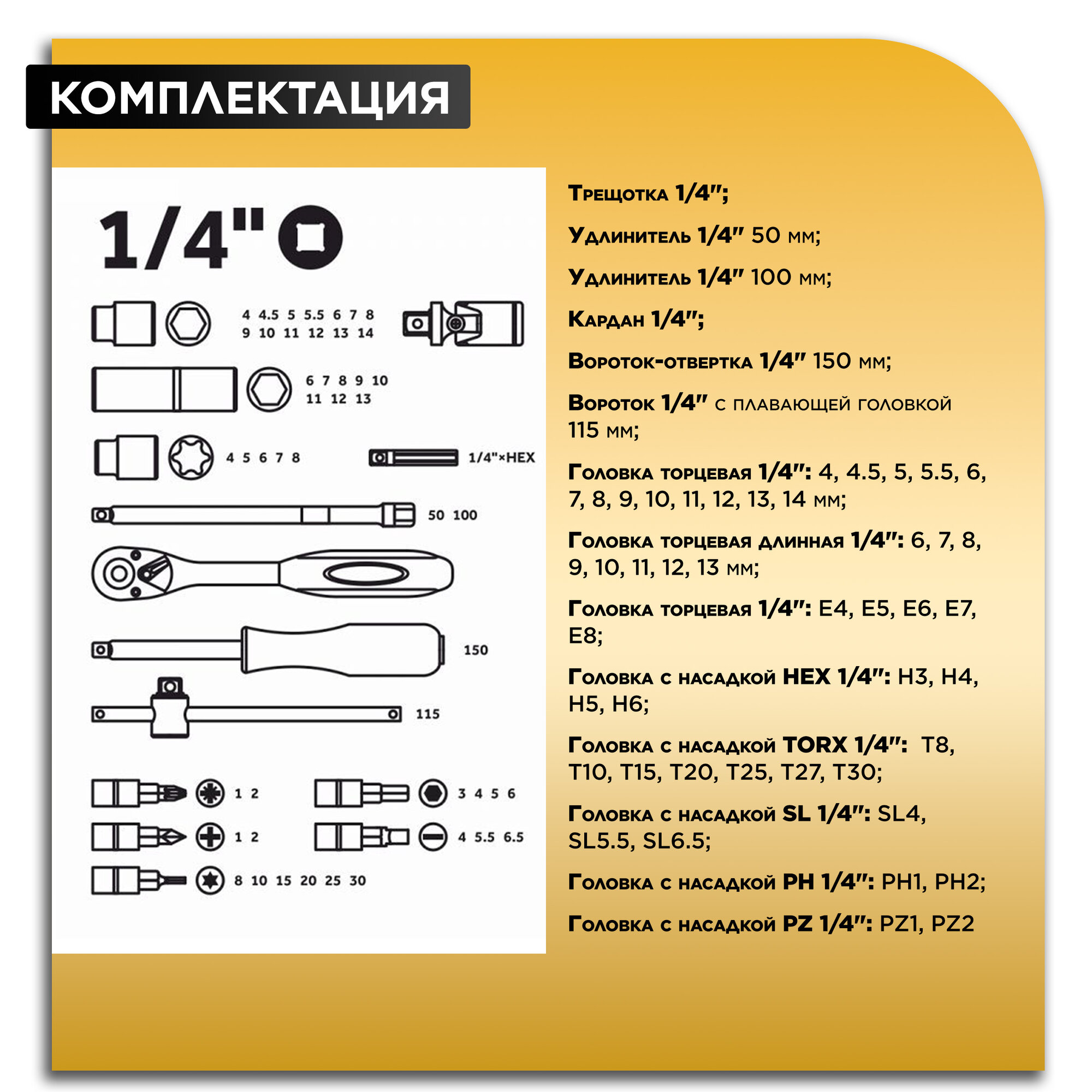 | Головки торцевые подробно | 1/2": 10, 11, 12, 13, 14, 15, 16, 17, 18, 19, 20, 21, 22, 23, 24, 27, 30, 32 мм; Torx 1/2": E20, E21, E22, E23, E24; длинные 1/2": 16, 17, 18, 19, 20, 21, 22 мм; удлинитель 1/2": 125, 250 мм; свечные 1/2": 16, 21 мм; трещотка 1/2"; 1/4": 4, 5, 6, 7, 8, 9, 10, 11, 12, 13, 14 мм; Torx 1/4": E4, E5, E6, E7, E8; длинные 1/4": 4, 5, 6, 7, 8, 9, 10 мм; трещотка 1/4"; удлинитель 1/4": 50, 100 мм; карданный шарнир 1/2", 1/4"; вороток т-образный 1/4": 115 мм; 3/8": 10, 11, 12, 13, 14, 15, 16, 17, 18, 19 мм; Torx 3/8": E10, E11, E12, E13, E14, E15, E16, E17, E18; длинные 3/8": 10, 11, 12, 13, 14, 15 мм; трещотка 3/8"; свечная 3/8": 21 мм; карданный шарнир 3/8" |