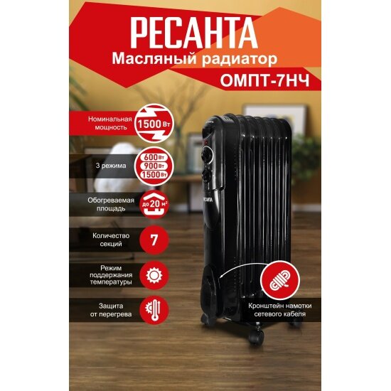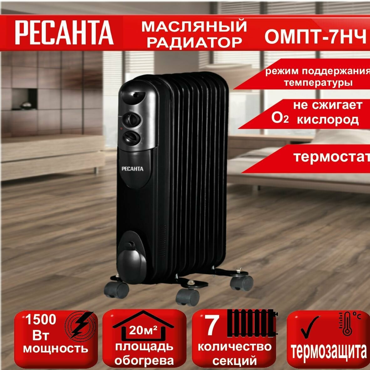 Масляный радиатор Ресанта ОМПТ-7НЧ, с терморегулятором, 1500Вт, 7 секций, 3 режима, черный [67/3/13]