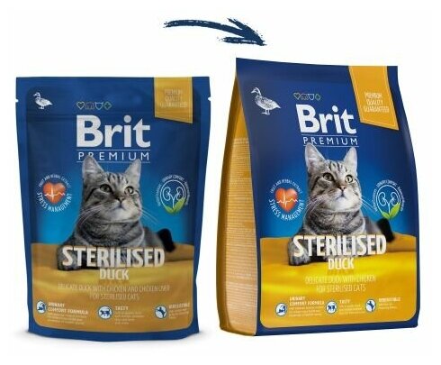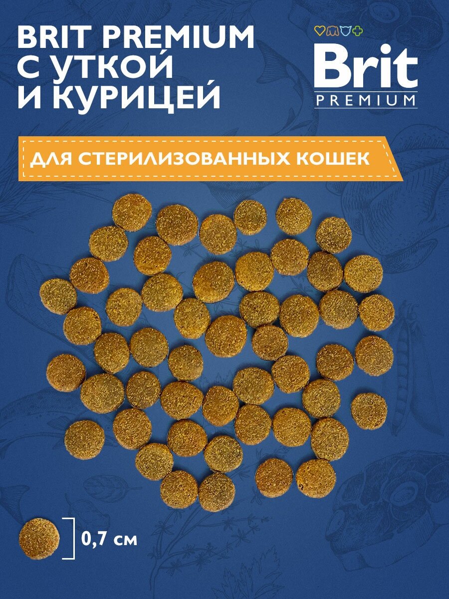 Корм сухой для взрослых кошек BRIT Premium Cat Sterilised Утка, курица, для кастрированных и стерилизованных, 800г