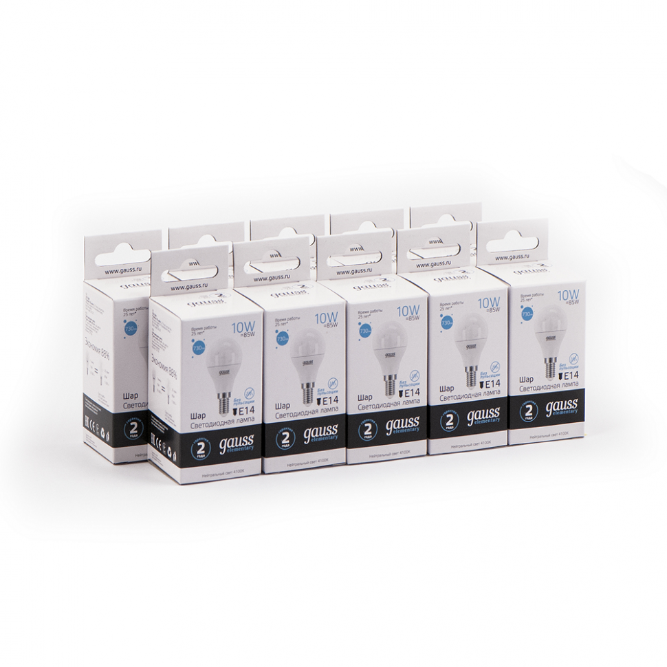(10 шт)Лампа Gauss Elementary Шар 10W 730lm 4100K Е14 LED 1/10/100