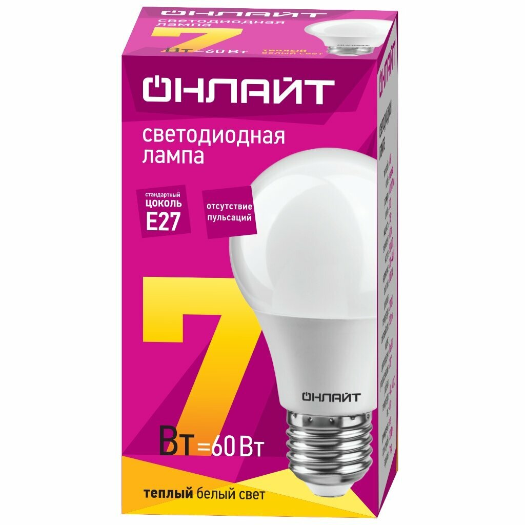 Лампа светодиодная E27, 7 Вт, 60 Вт, груша, 3000 К, свет теплый белый, Онлайт