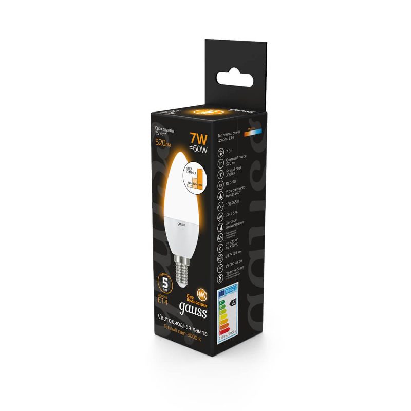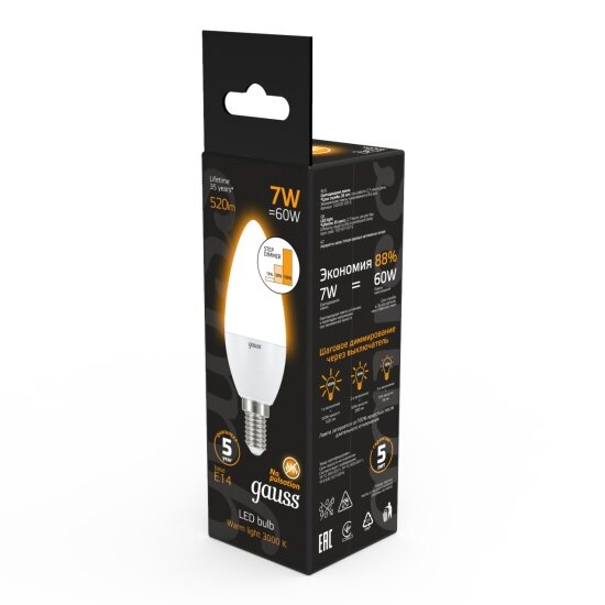 Лампа светодиодная свеча 7Вт E14 теплая 2700К step dimmable Gauss LED 103101107-S 1/10/50