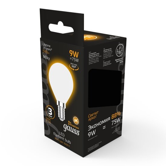 Gauss Лампа Filament Шар 9W 590lm 3000К Е14 milky LED 1/10/50 105201109