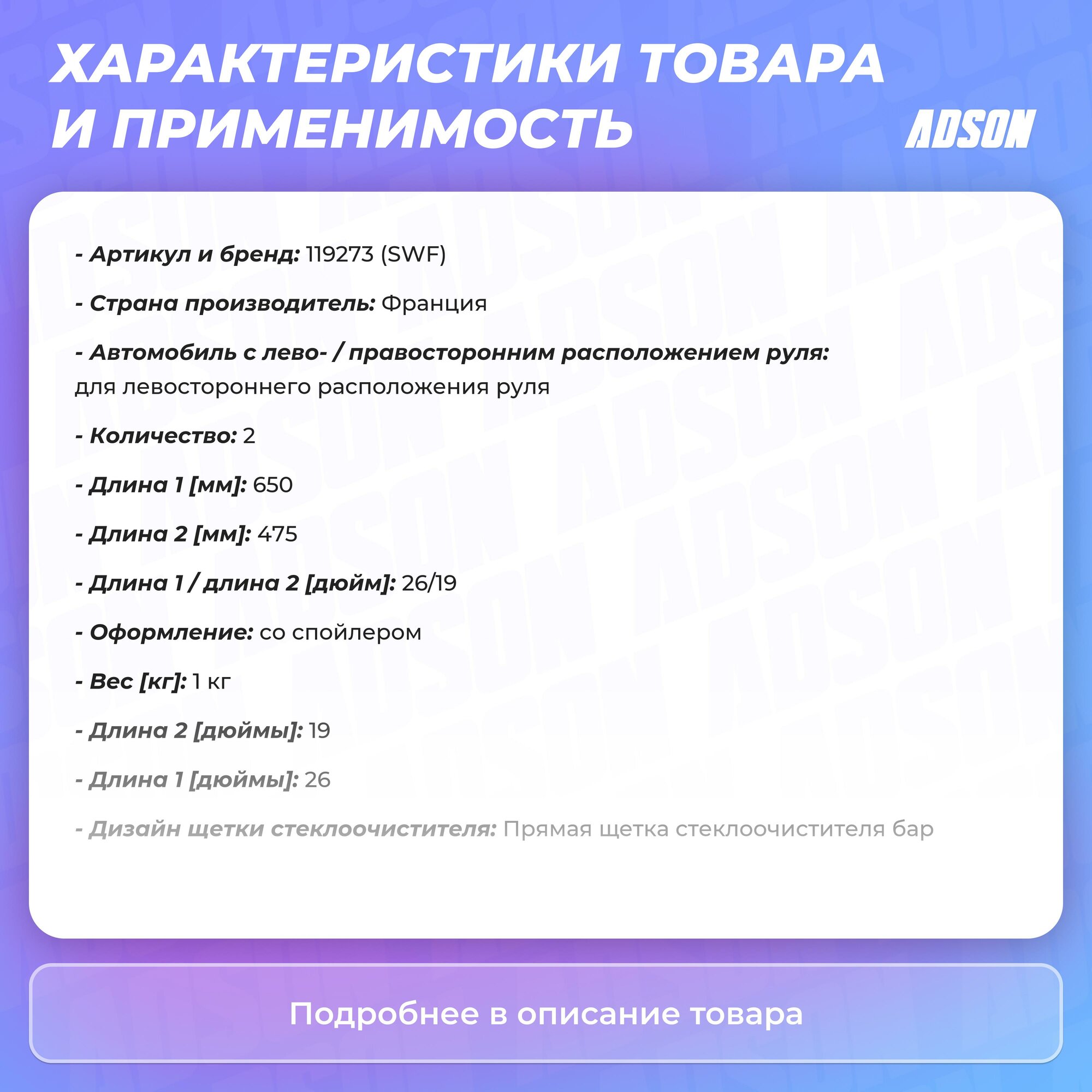 SWF 119 273 (119273 / 3397007863 / 3AB998002) щётки с / о бескаркасные к-кт swf 650+475mm