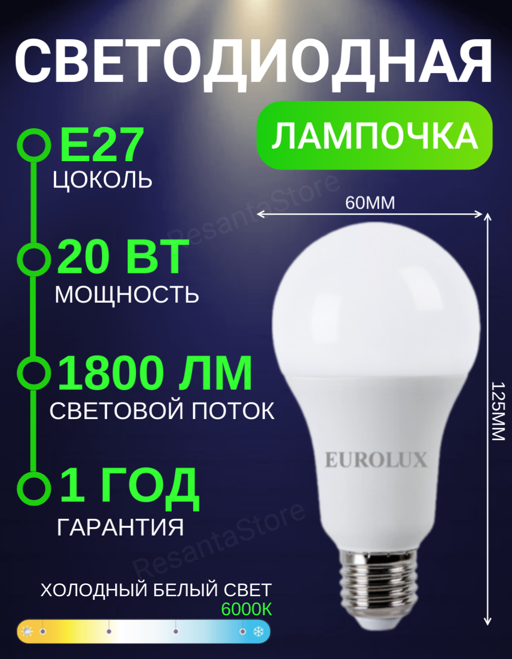 Лампа светодиодная LL-E-A70-20W-230-6K-E27 (груша 20Вт холод. Е27) Eurolux интересное: