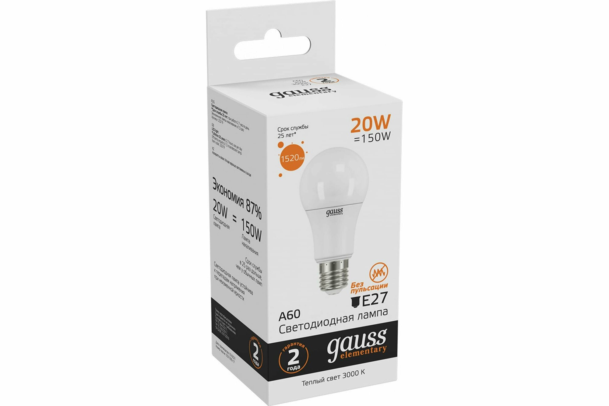 (5 шт)Лампа Gauss Elementary A60 20W 1520lm 3000K E27 LED 1/10/40