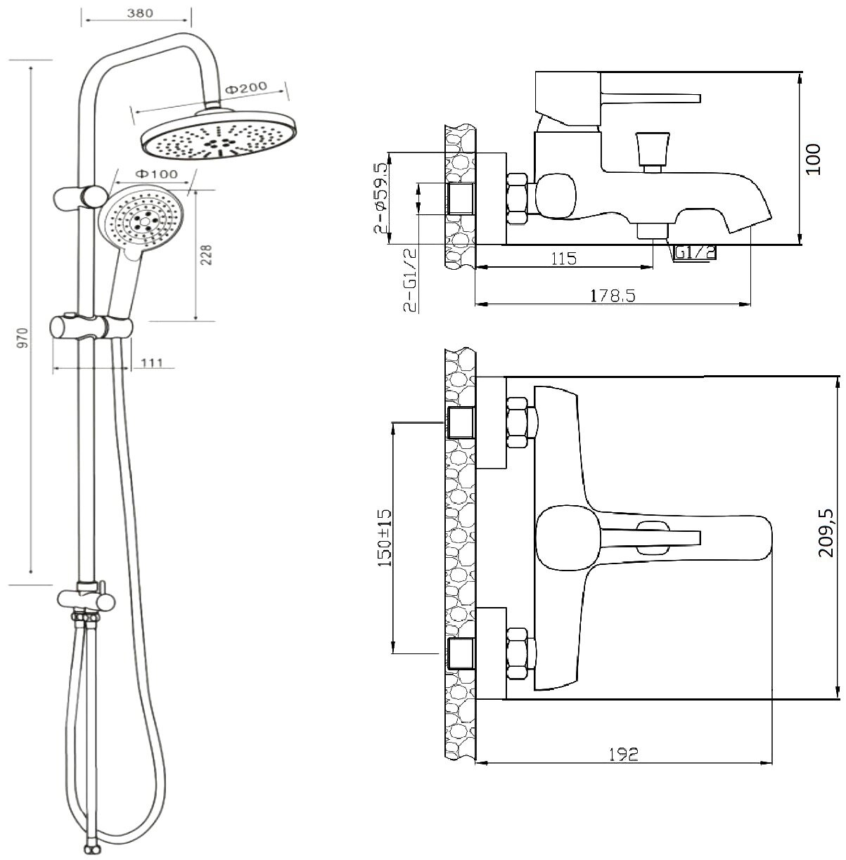 | Комплектация | Верхний душ;Держатель для лейки;Душевая лейка;Душевая штанга;Смеситель;Шланг для душа;Шланговое подключение |