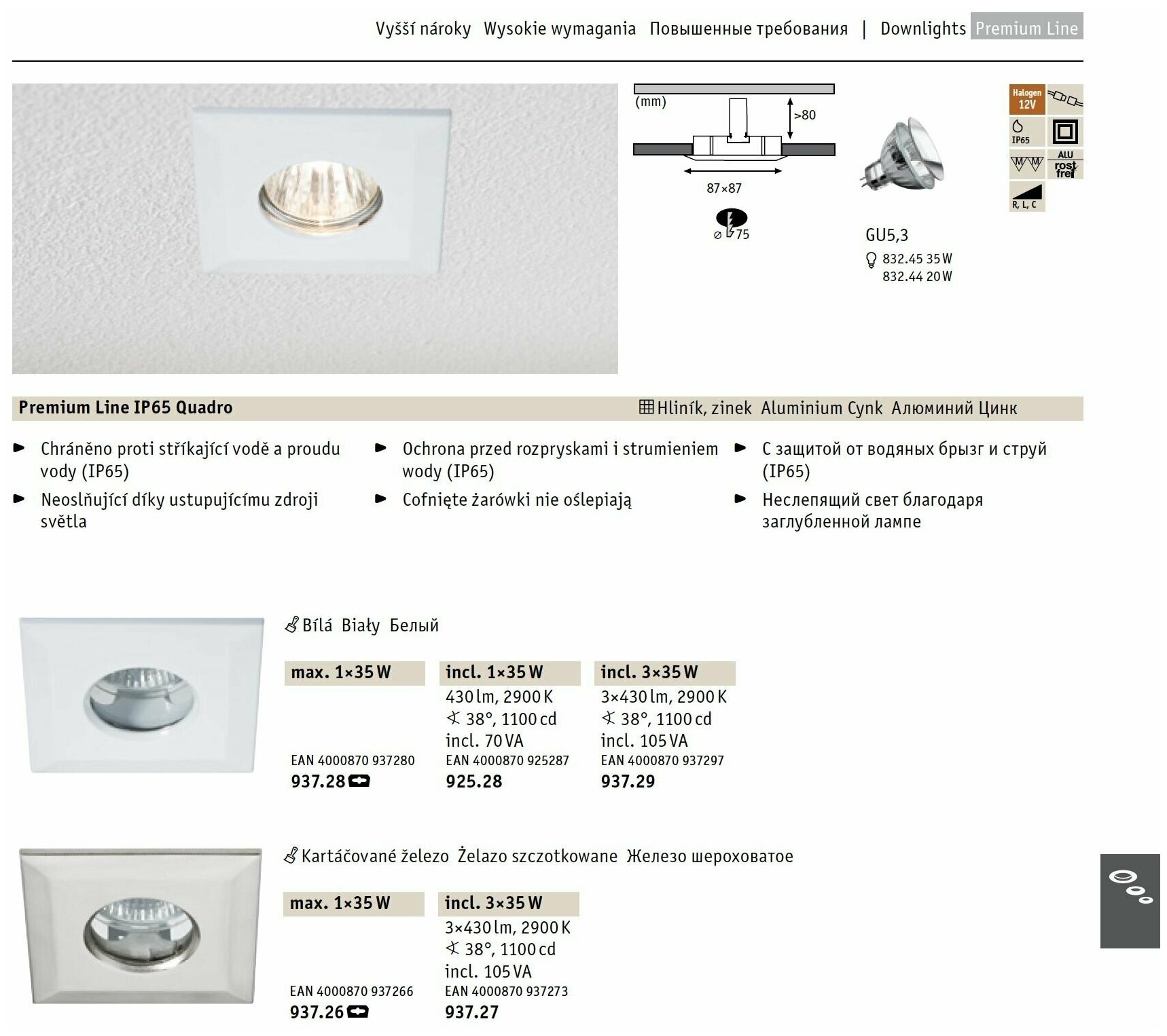 Купить Светильник встраиваемый Paulmann Premium Quadro 87x87мм макс.35Вт IP65 GU5.3 230/12В Железо Без лампы 93726.