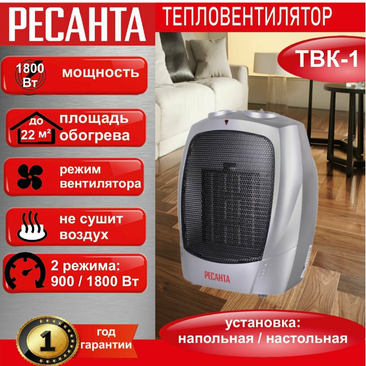 Тепловентилятор керамический Ресанта ТВК-1, 1800Вт, с термостатом, 2 режима, серебристый, черный [67/2/3]