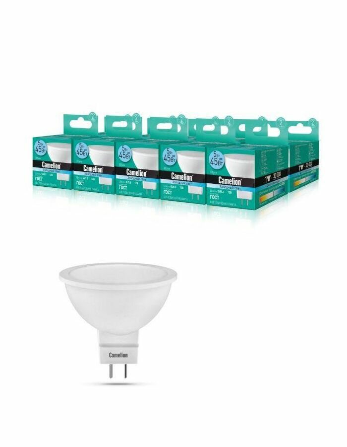 Лампочка светодиодная Camelion MR16, 5Вт 220В, цоколь GU5.3, нейтральный свет 4500К, 1 шт.