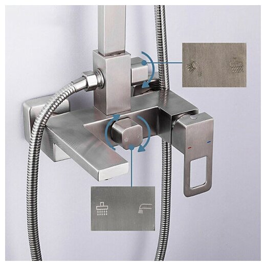 | Дополнительная информация | смеситель: сталь SUS304, картридж D=35 мм излив: стационарный диверторы: два 2-х ходовых с керамическими пластинами установочный комплект + штанга: сталь SUS304, H=825-1280 мм верхняя лейка: сталь SUS304, антикальк ручная лейка: сталь SUS304, 100х80 мм, антикальк шланг:оплётка сталь SUS304 форма бокового душа: квадратная |