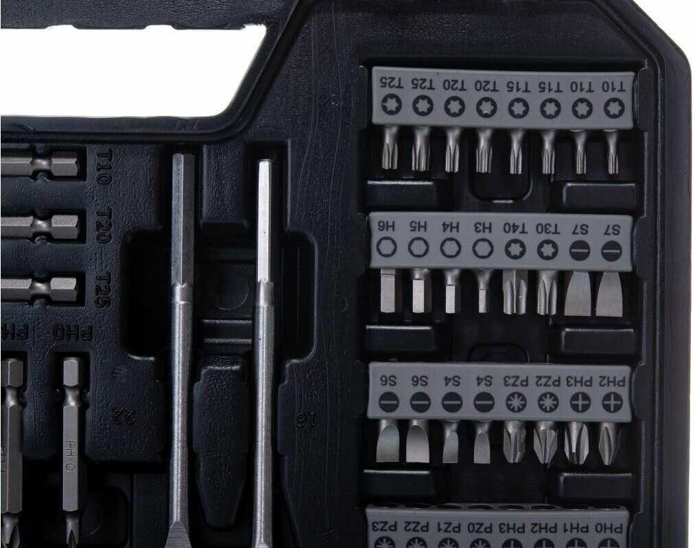| Биты подробно | L = 25 мм: шлицевые 4/4/6/6/7/7 мм, Phillips PH 0/0/1/1/2/2/2/3/3/3.0/0/1/1/2/2, PZ 2/3/3/3, Torx T10 / 10/15/15/20/20/25/25/30/40, SW 3/4/5/6; L = 50 мм: шлиц 4/6 мм, PH 0/1/2/3, PZ 0/1/2/3, Torx T10/20/25; |