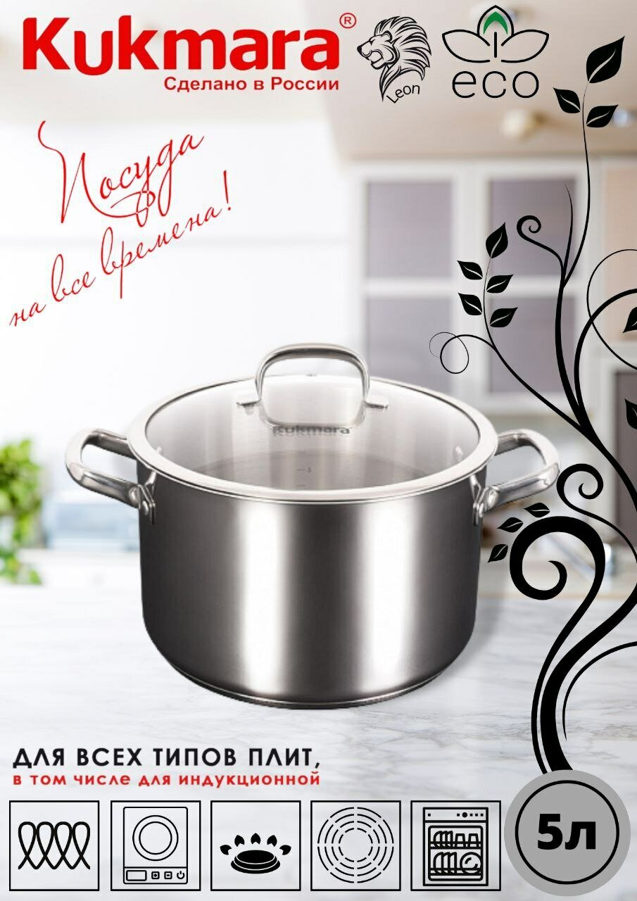 Кастрюля из нержавеющей стали Kukmara линии "LEON" 5л, д.22см, со стекл. крышкой
