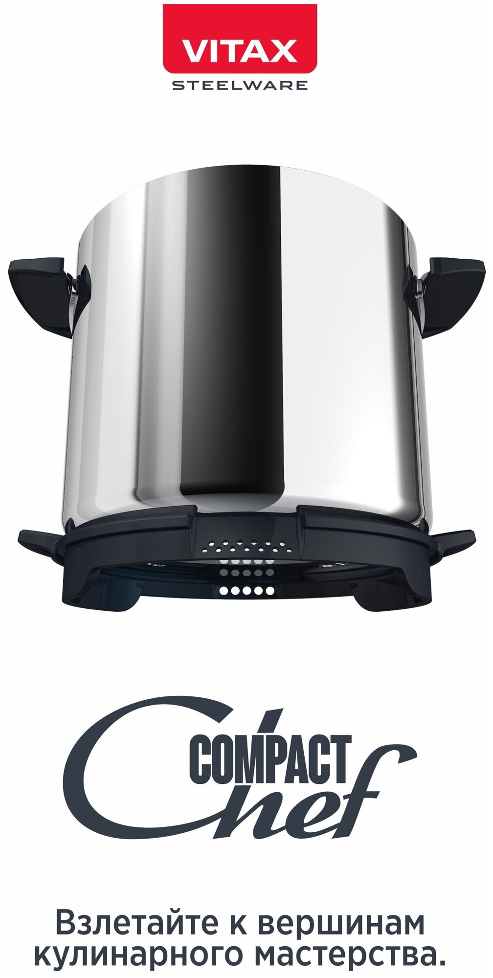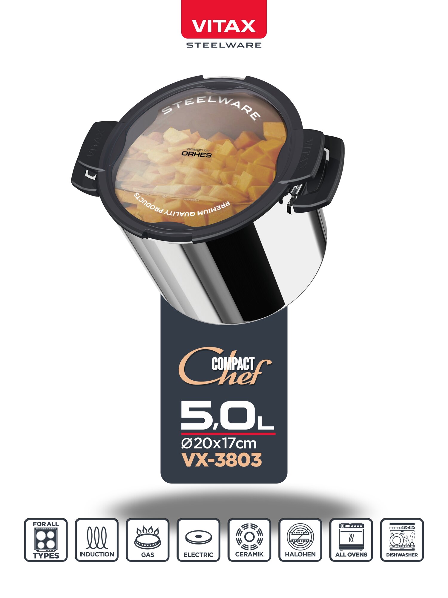 Кастрюля из нержавеющей стали со стеклянной плоской крышкой крышкой-дуршлагом Vitax VX-3803 5л Compact Chef