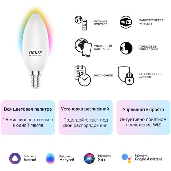 Умная Wi-Fi лампочка Gauss Smart Home C37 5W 470лм E14, управление голосом/смартфоном, с изменением цвета и температуры, димируемая