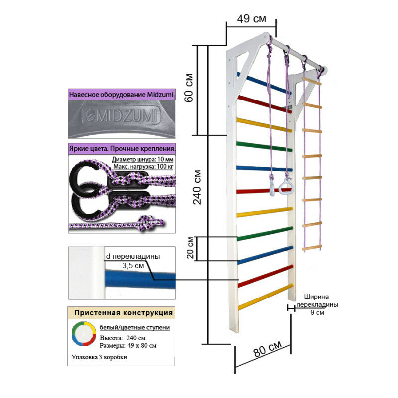 | Подробная комплектация | деревянная шведская стенка Г-образной формы, гимнастические кольца, веревочная лестница |