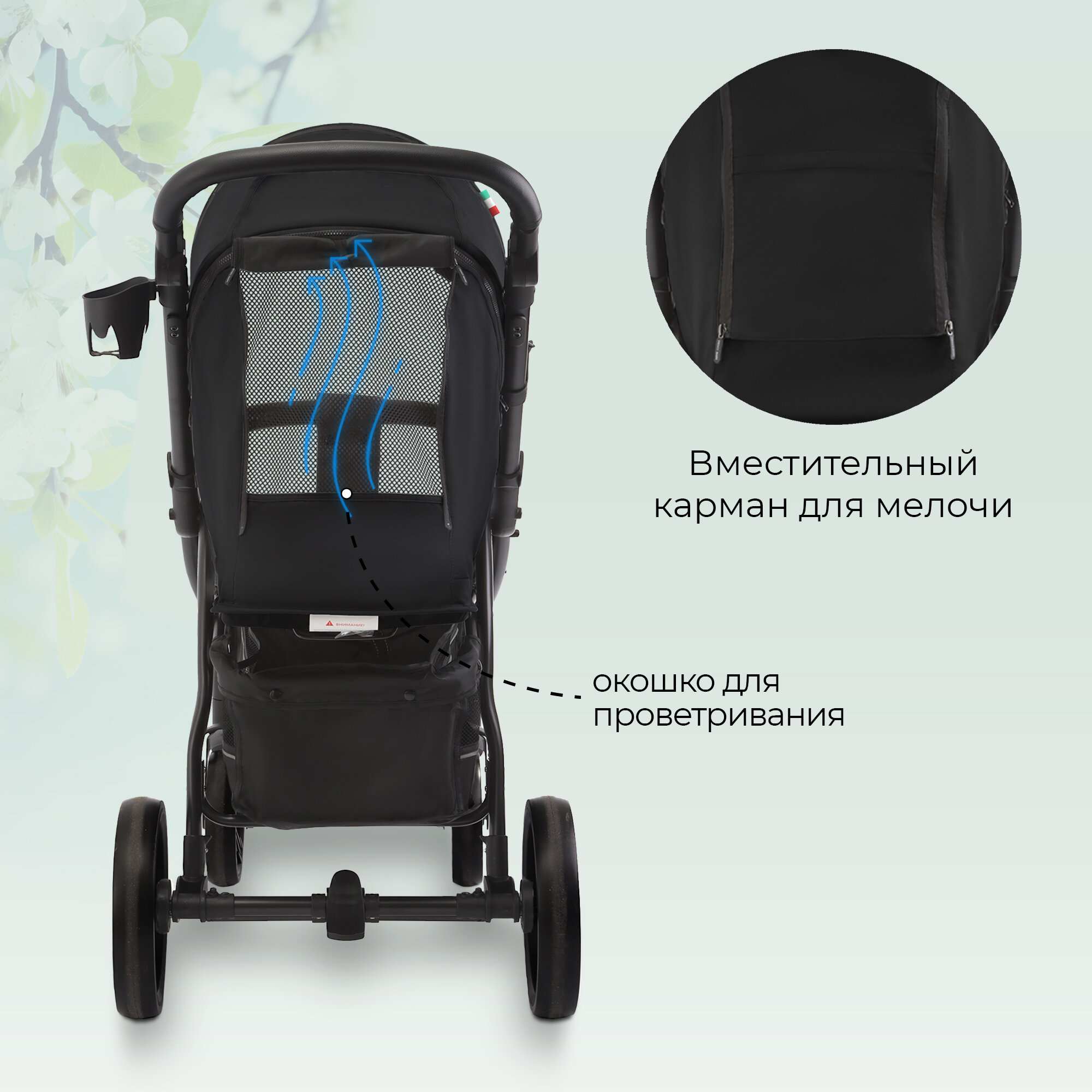 | Плюсы: | Большие колеса,наличие амортизации,удобная накидка на ножки с молнией,окошко для родителя,вместительная корзина для покупок |