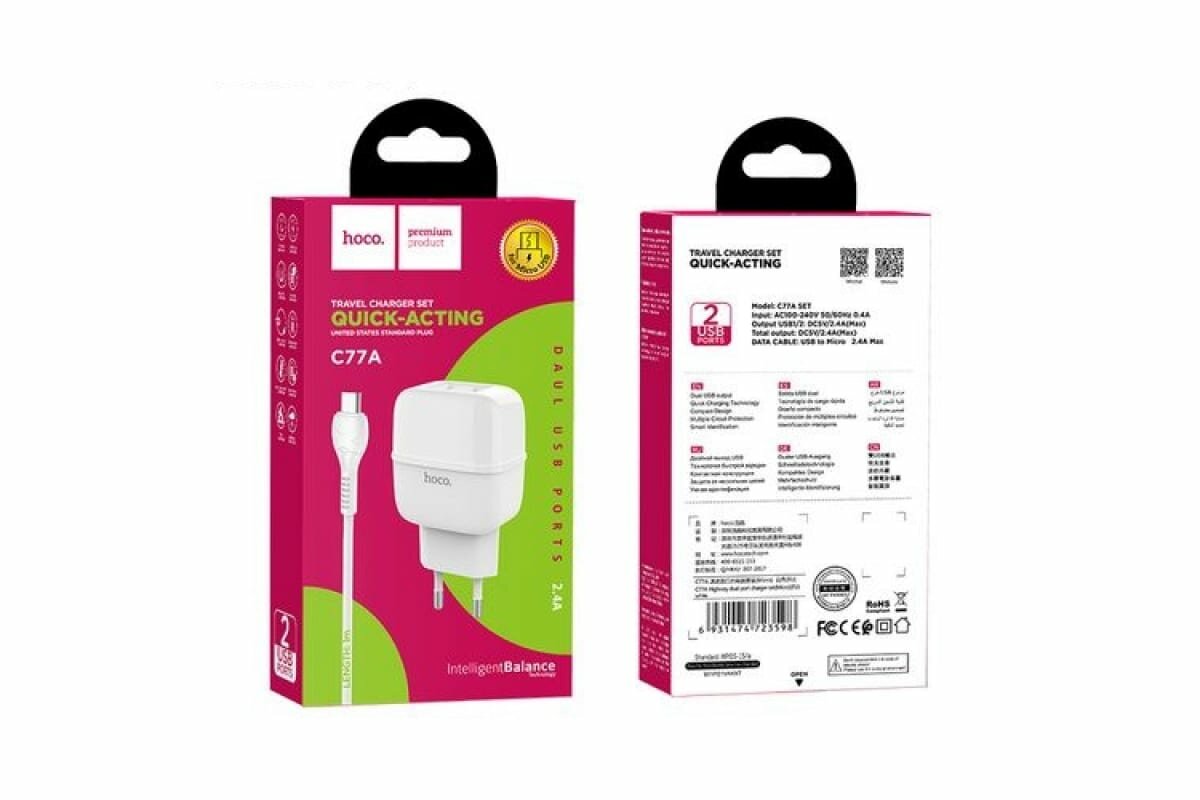 Сетевое зарядное устройство (СЗУ) Hoco C77A (2 USB) + кабель MicroUSB, 2.4 А, белый