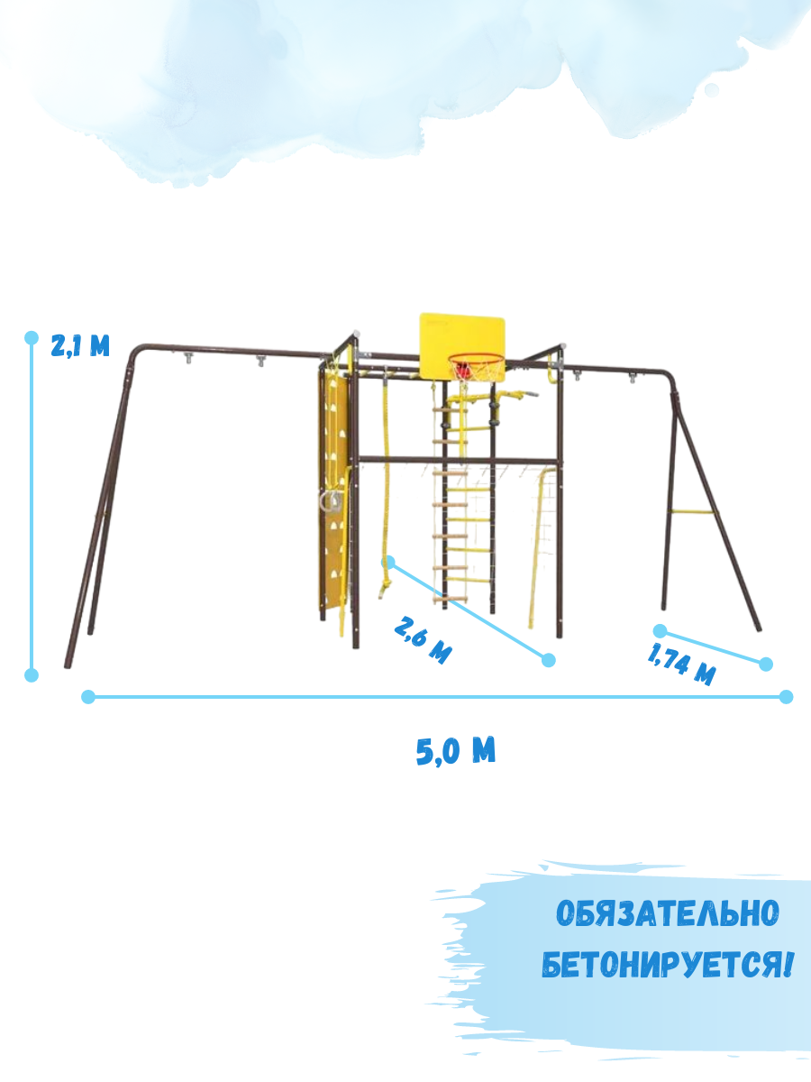 | В комплекте | баскетбольное кольцо, веревочная лестница, ворота, гимнастические кольца, канат, рукоход, скалолазная стенка, турник |