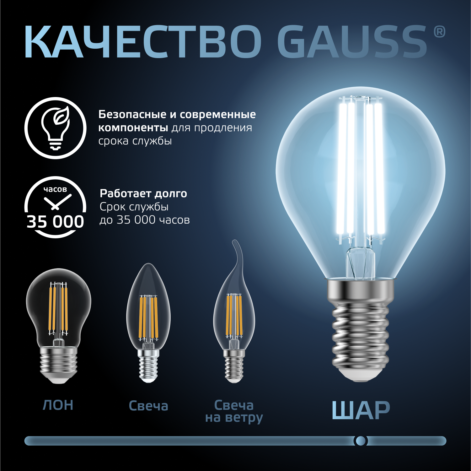 Лампа филам. Gauss Filament 9Вт цок.:E14 шар 220B 4100K св.свеч.бел.нейт. (упак.:10шт) (105801209)