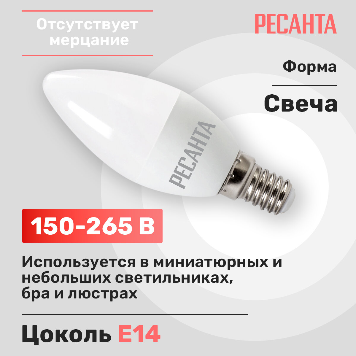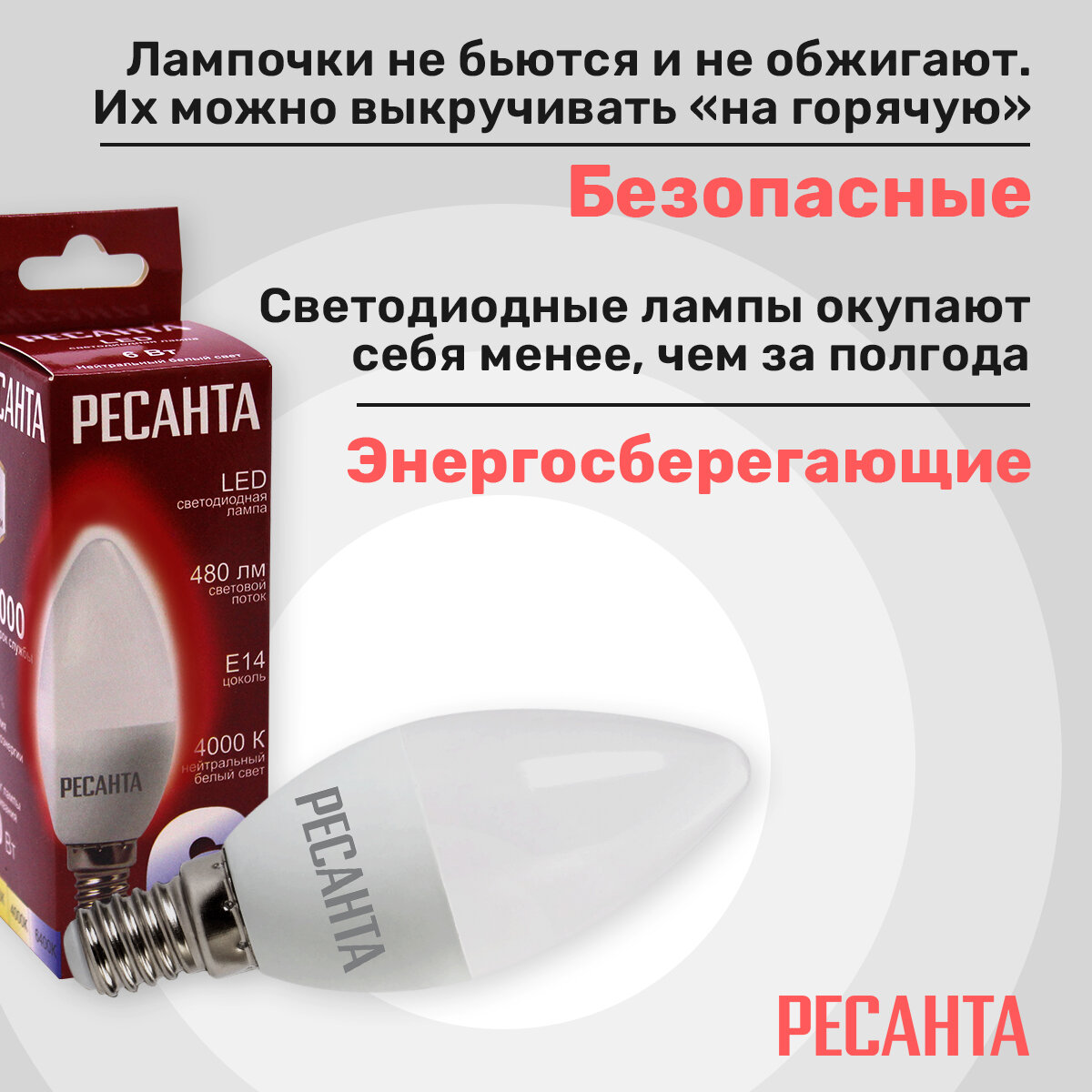 Светодиодная лампа Ресанта LL-R-C37-6W-230-4K-E14 (свеча, 6Вт, нейтр, Е14), 76/1/4