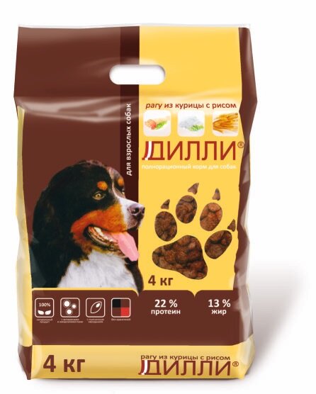 СохранитьСухой корм для взрослых собак, полнорационный, рагу из курицы с рисом, Дилли 4 кг интересное: