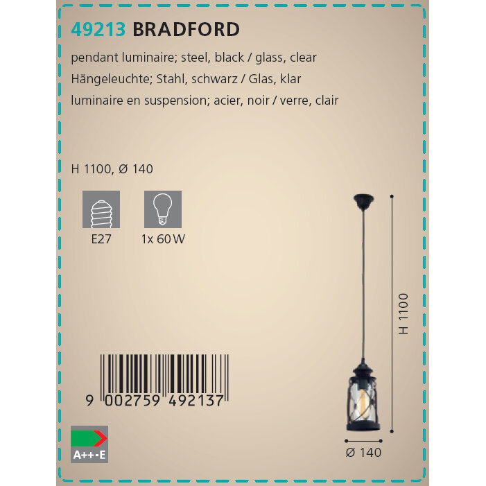 49213 Подвес BRADFORD, 1x60W (E27), ?140, H1100, сталь, черный/cтекло