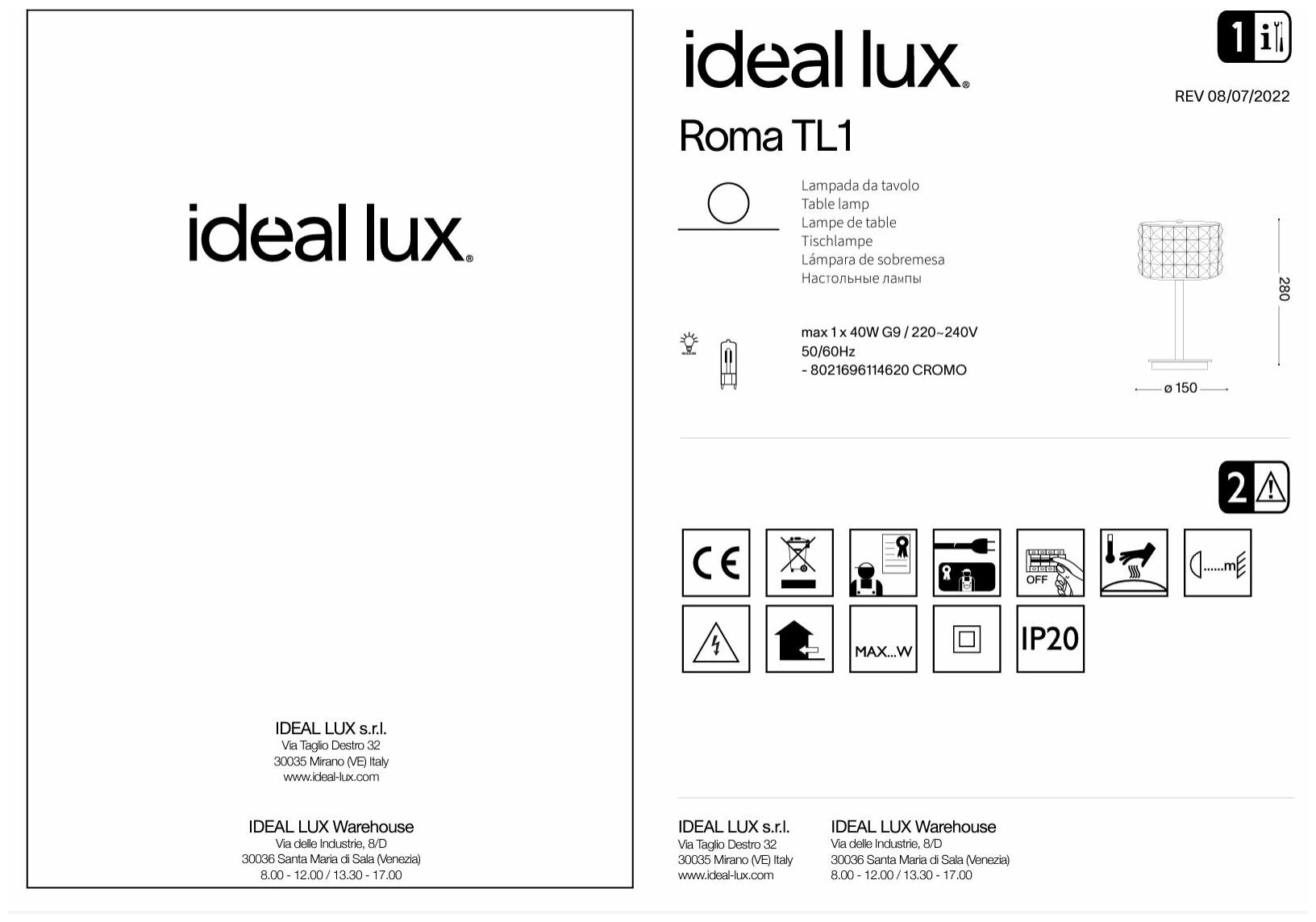 Лампа настольная Ideal Lux Roma TL1 макс.1х40Вт IP20 G9 230В Прозрачный/Хром Металл/Хрусталь/Стекло Выключатель 114620. интересное: