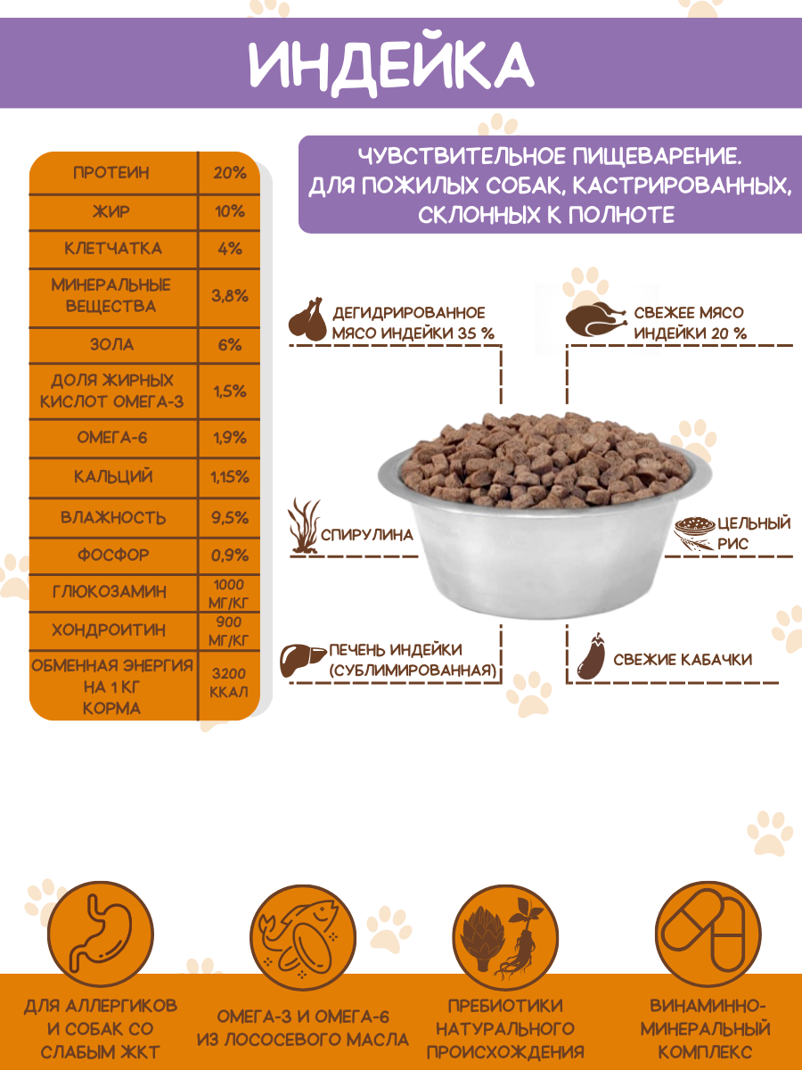 | Состав | дегидрированное мясо индейки 24 %, свежее мясо индейки 15 %, бурый цельный рис, печень индейки (сублимированная), сушеное яблоко, свежие кабачки, свежая столовая тыква, спирулина, Юкка Шидигера, жир лососевый (естественный источник Омега-3 и Омега-6), пивные дрожжи (источник маннанолигосахаридов), экстракт цикория, смесь экстрактов куркумы, грейпфрута, сизигиума (природные источники натурального витамина E), Мико Карб, пробиотики (Bacillus subtilis и Bacillus licheniformis), витаминно-минеральный комплекс. |