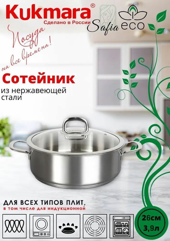 Сотейник Kukmara из нержавеющей стали 26 см со стеклянной крышкой, линия "Safia", 3,9 л