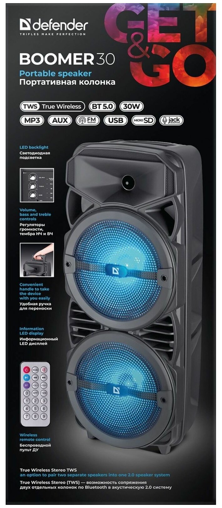 Портативная колонка Defender Boomer 30, 30Вт, 1800мАч, BT, FM, USB, microSD, AUX, подсветка