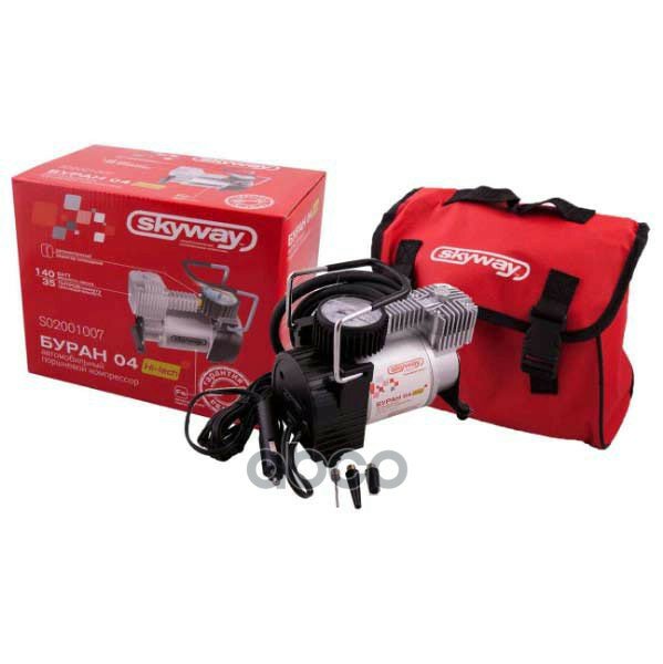компрессор SKYWAY БУРАН-04 Hi-Tech (мет. 35л/мин, 7АТМ, 140ВТ, каб 3м, шл 1м прямой, улуч. охл.) в прикуриватель, сумка, S02001007