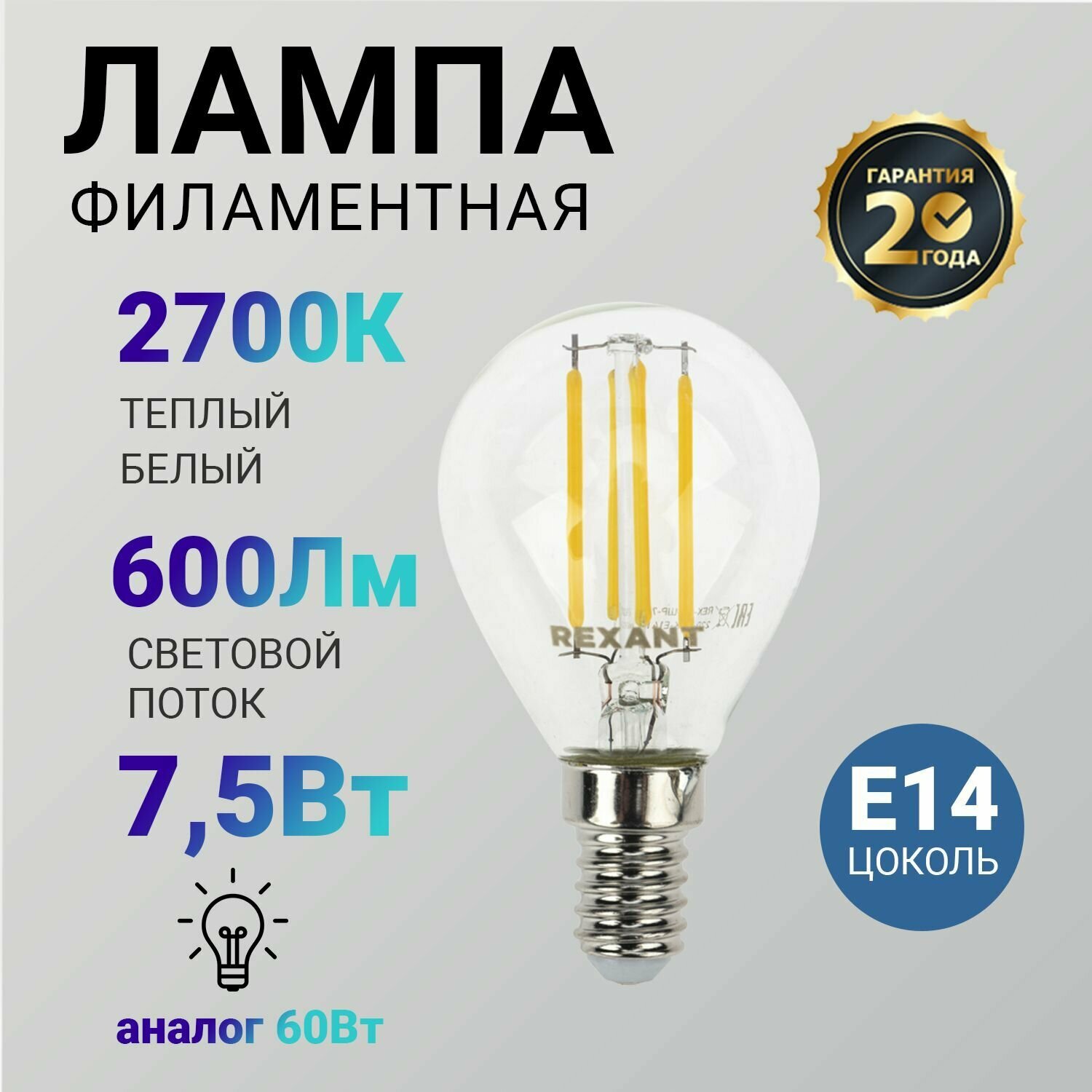 Лампа филаментная Rexant Шарик GL45, 7.5 Вт, 600 Лм, 2700K, E14 в прозрачной колбе интересное: