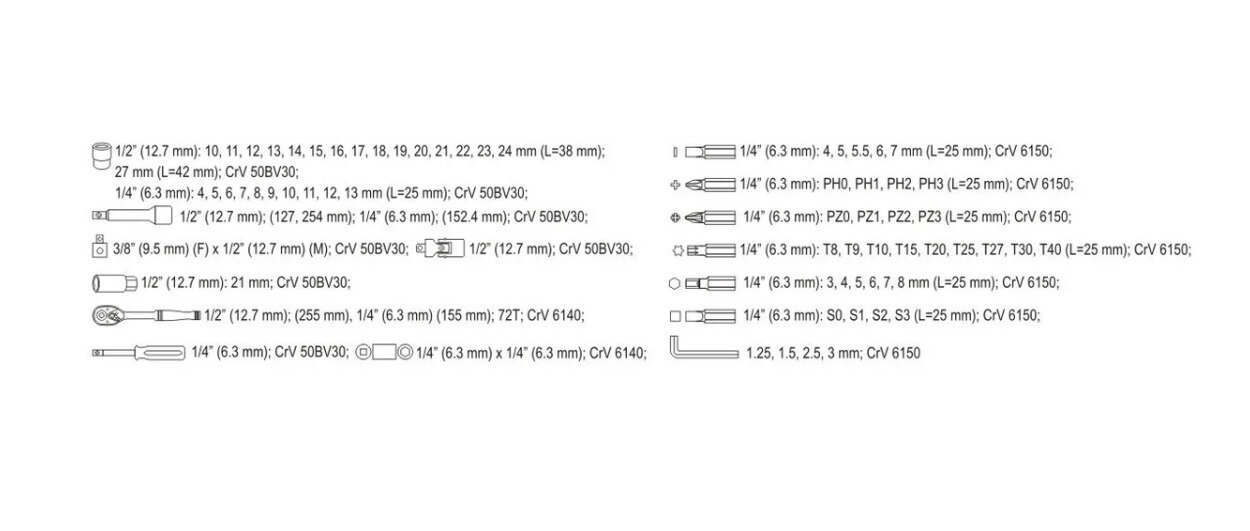 | Головки торцевые подробно | 1/2": 10, 11, 12, 13, 14, 15, 16, 17, 18, 19, 20, 21, 22, 23, 24, 27 мм; свечная 21 мм; 1/4": 4, 5, 6, 7, 8, 9, 10, 11, 12, 13 мм; 1/2": удлинители - 127, 254 мм; трещотка 255 мм; переходник 1/2"-3/8"; 1/4": удлинитель - 152.4 мм; трещотка 155 мм; переходник квадрат-шестигранник 1/4"-1/4" |