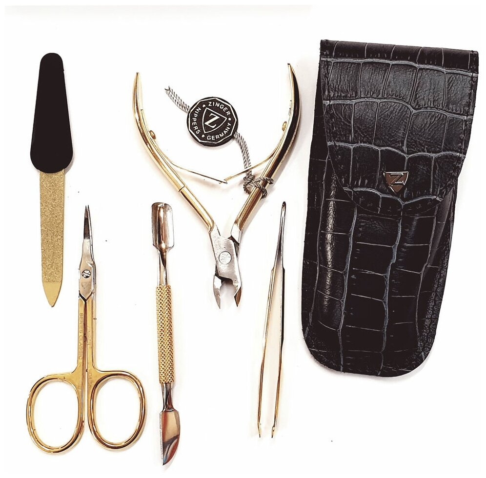 Дорожный маникюрный набор в компактном чехле из натуральной кожи, 5 инструментов с золотистыми ручками интересное: