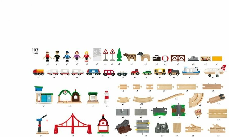 | Дополнительная информация | два грузовых состава, пассажирский состав, автомобили, фигурки людей и животных, арочный мост, пароход, маяк, подъемный кран, самолет, взлетная полоса, железнодорожный переезд, железнодорожные станции, железнодорожный переезд со шлагбаумом, морской порт, портовый кран с магнитным захватом |