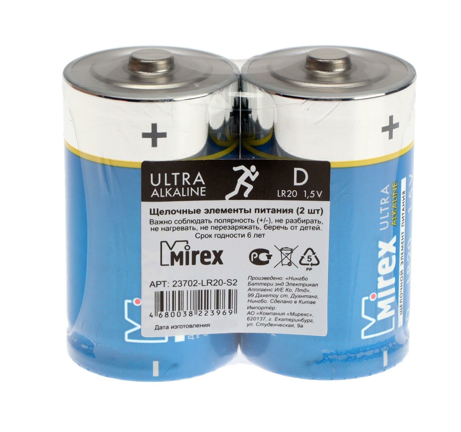 Батарейка D щелочная Mirex LR20 в термопленке 2шт.