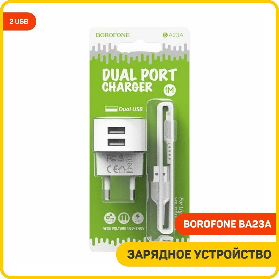 Купить Сетевое зарядное устройство (СЗУ) Borofone BA23A (2 USB) + кабель Lightning, 2.4 А, белый