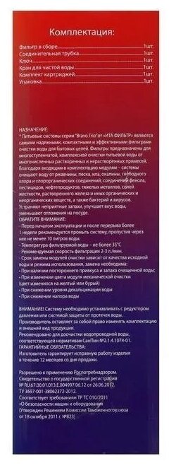 | Дополнительная информация | в комплекте: стандартный 10 дюймовый корпус; картридж для механической очистки (полипропиленовый); картридж для сорбционной очистки (угольный); картридж для комплексной очистки (угольный); набор для соединения питьевой системы с водопроводом и краном чистой воды; поршневой кран для чистой воды (излив); ключ для снятия колб; крепления; инструкция; замена картриджа - не реже 1 раза в 6 месяцев; для этой системы подходят все картриджи стандарта 10" |