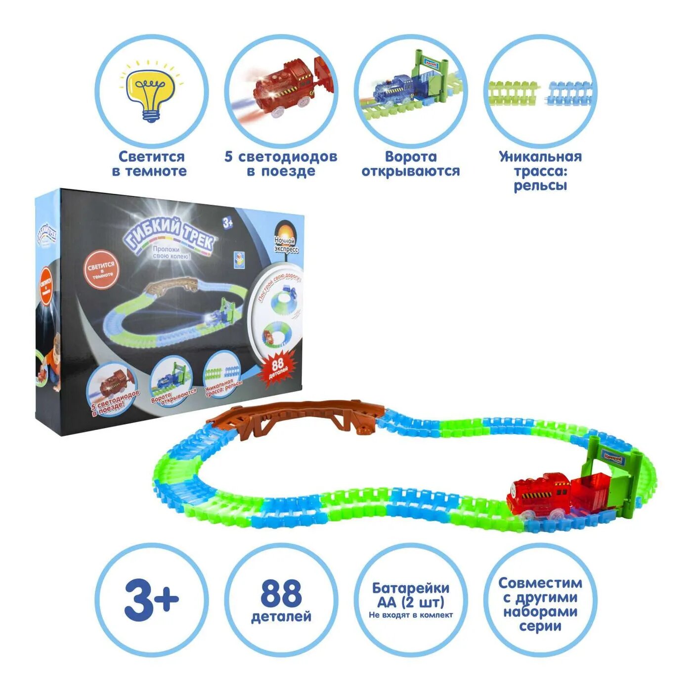1toy гибкий трек "Ночной Экспресс", ворота, мини-мост, паровоз со светом, 88 дет, дорога светится в темноте