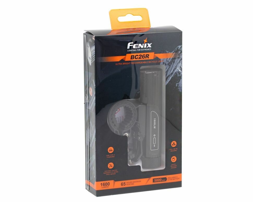 | Дополнительная информация | подробная комплектация: велофара BC26R, аккумулятор Fenix ARB-L21-5000, задний фонарь BC05R v2.0, кабель USB-A - USB-C, быстросъёмное крепление на руль велосипеда (с резиновыми вставками под рули разных диаметров), запасное уплотнительное кольцо, инструкция, гарантийная карточка; вес: 155 г |