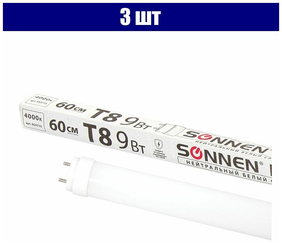 Купить Комплект 3 шт. Лампа-трубка светодиодная SONNEN, 9 Вт, 30000 ч, 60 см, нейтральный белый (аналог 18 Вт люминесцентной лампы), LED T8-9W-4000-G13, 453715