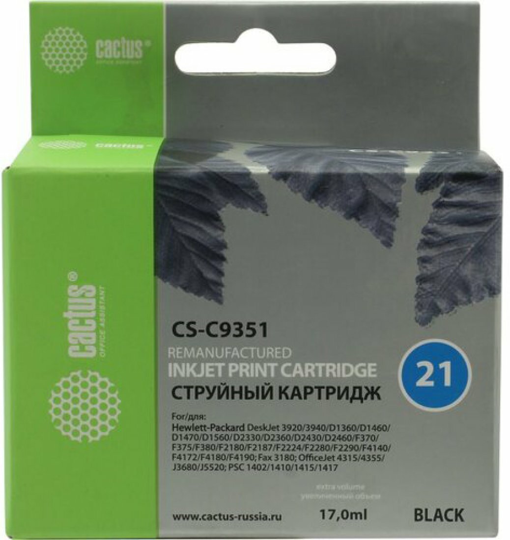 Картридж струйный Cactus CS-C9351 №21 черный (17мл) для HP DJ 3920/3940/D1360/D1460/D1470/D1560/D2330/D2360/D2430/D2460/F370/F375/F380/F2180/F2187/F2224/F2280/F2290/F4140/F4172/F4180/F4190