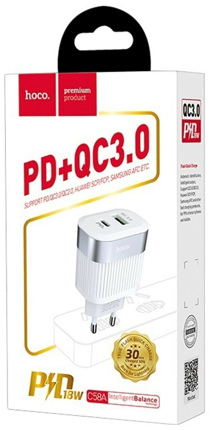 Сетевое зарядное устройство, 1 USB 3.0 QC+1 PD 20W (C58A), HOCO, белый