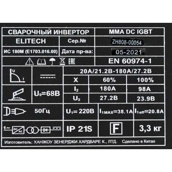 ELITECH ИС 180М (E1703.016.00) Инвертор,140-250В,6.1кВт,20-180А,ПВ=180А/60%,O1.6-5мм,2.7кг., шт ELITECH