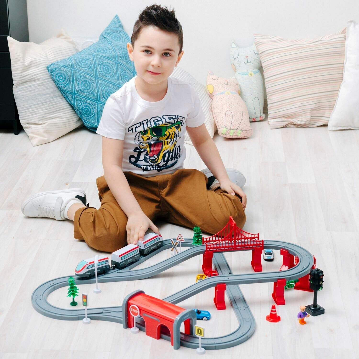 Железная дорога игрушка "Мой город, 80 предметов", на батарейках интересное: