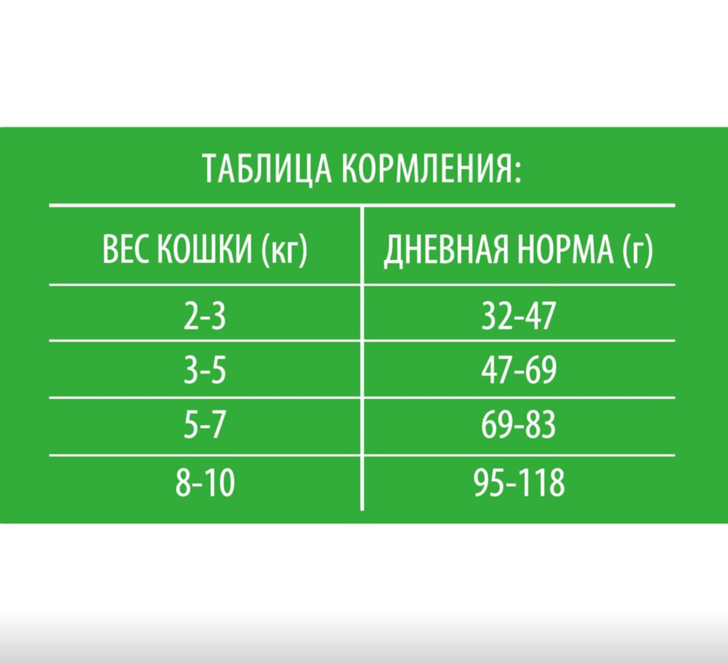 | Дополнительная информация | при вводе нового корма смешайте его небольшое количество с привычной едой и в течение нескольких дней постепенно увеличивайте количество нового корма. Следуйте рекомендациям по ежедневному питанию, представленным в таблице. Количество корма может меняться в зависимости от таких факторов, как возраст и уровень активности. Корм следует давать сухим или увлажненным теплой водой. У животного всегда должен быть доступ к миске со свежей водой. |